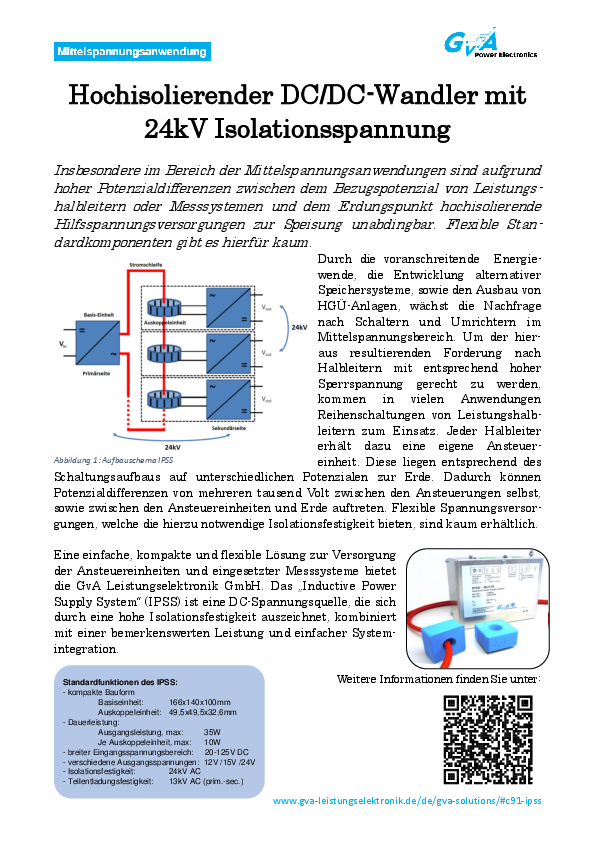 Our IPSS inductive power supply system implements the isolated supply of modules with different electrical potentials, e.g. for control modules in high-voltage applications or for series connection of power semiconductors. It is available as a standalone component or also supplemented by decoupling units or thyristor ignition modules.